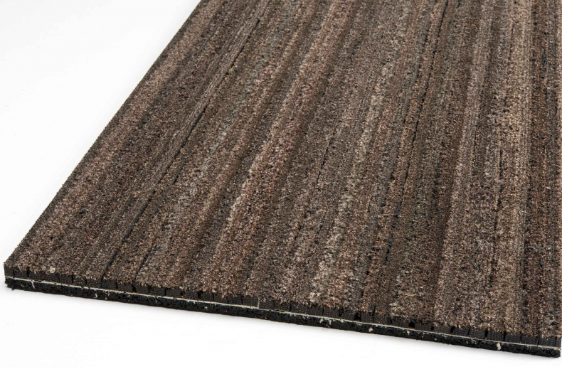 Paillasson 100 % en caoutchouc, surface en fibres de nylon, sur en dos renforcé en caoutchouc. Nuance: gris-noir-brun. Epaisseur: environ 22 mm. Poids: ± 8,85 kg / m².