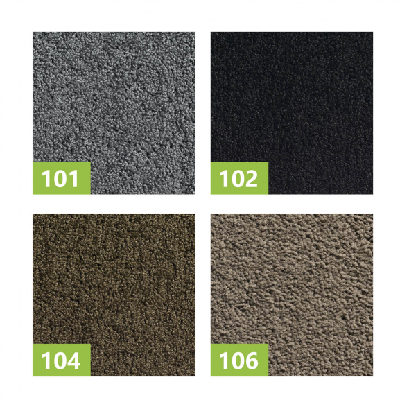 Paillasson 100 % en fibre polyamide, sur un dos renforcé en PVC. Epaisseur: environ 20 mm. Poids: ± 6,00 kg / m².